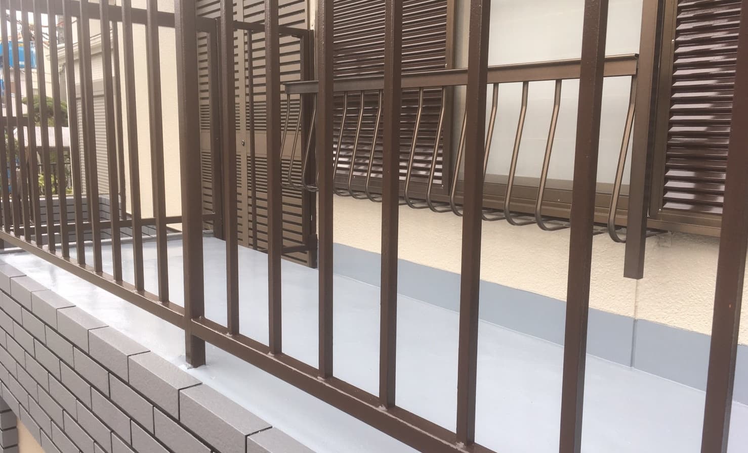 補修塗装後のタイル面に雨水等が染みないように、玄関前土間も防水で仕上げました。
