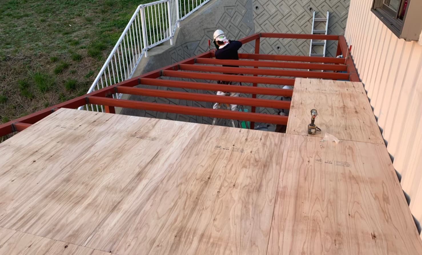 骨組みした鉄骨にベニヤ板を張り付けて行きます。