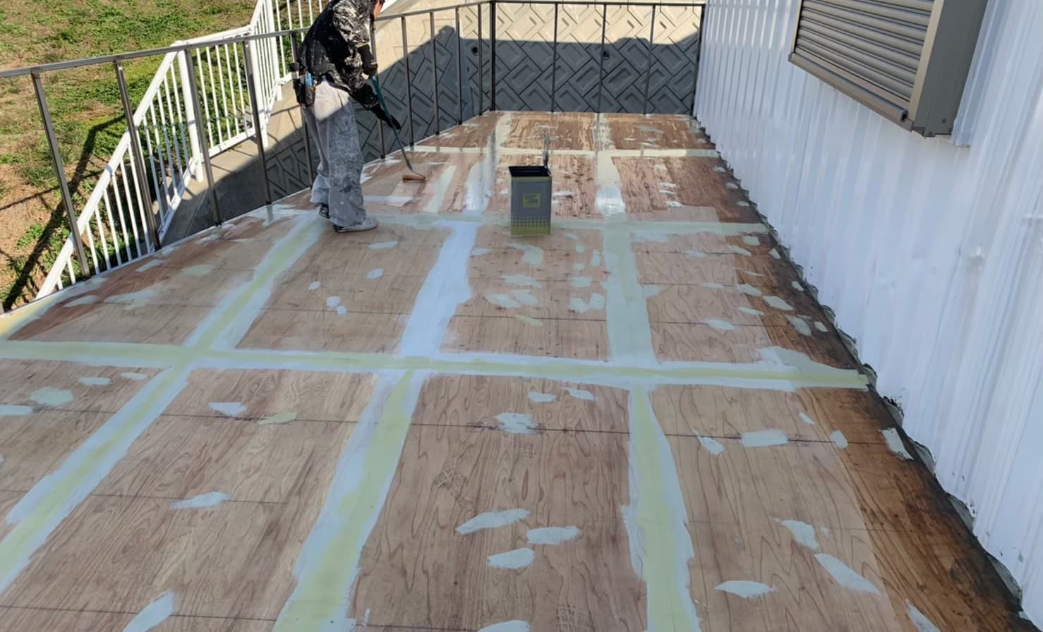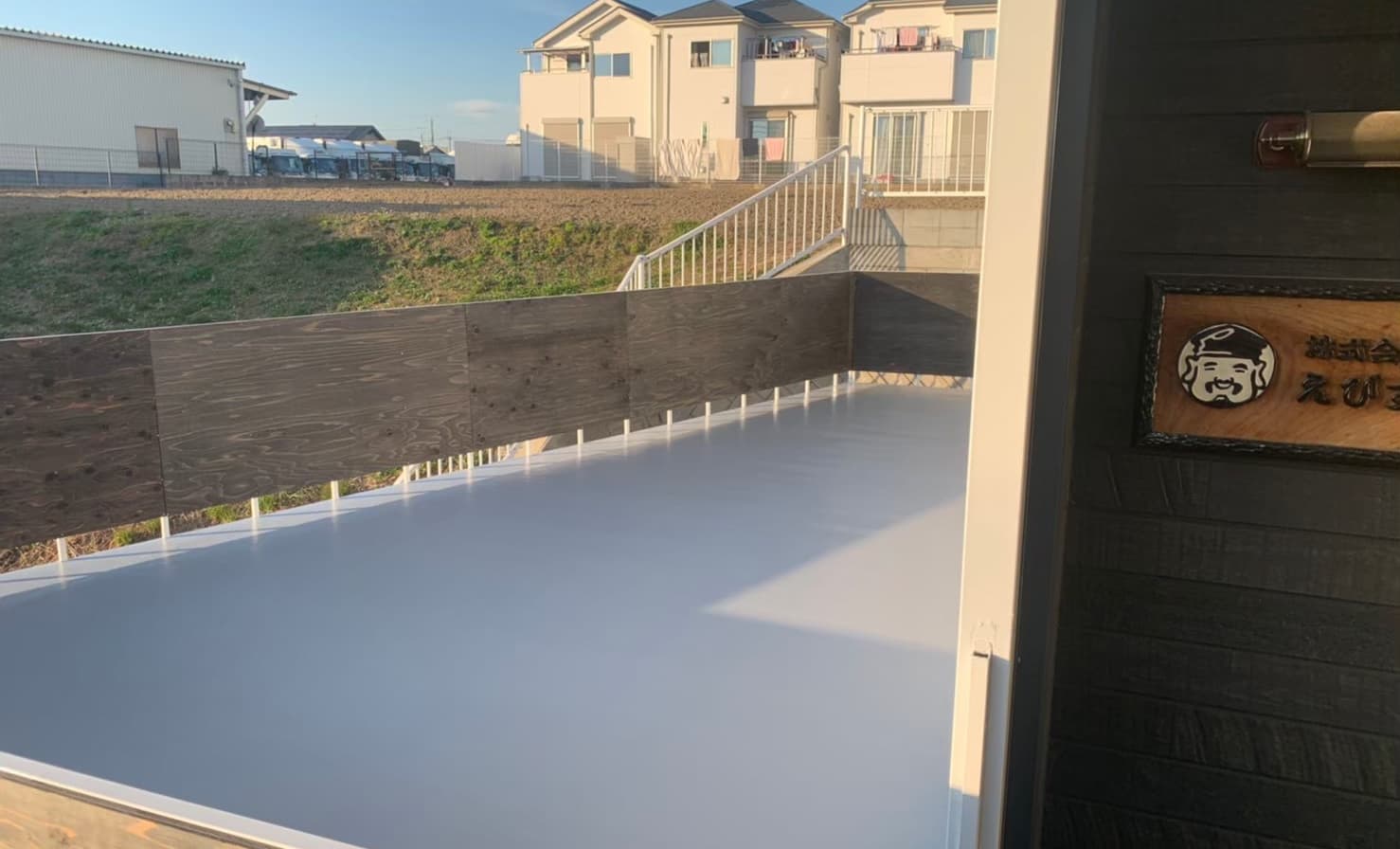 FRP防水で仕上げたテラスになります、手すり面には塗装を施した木板を張り仕上げました!!