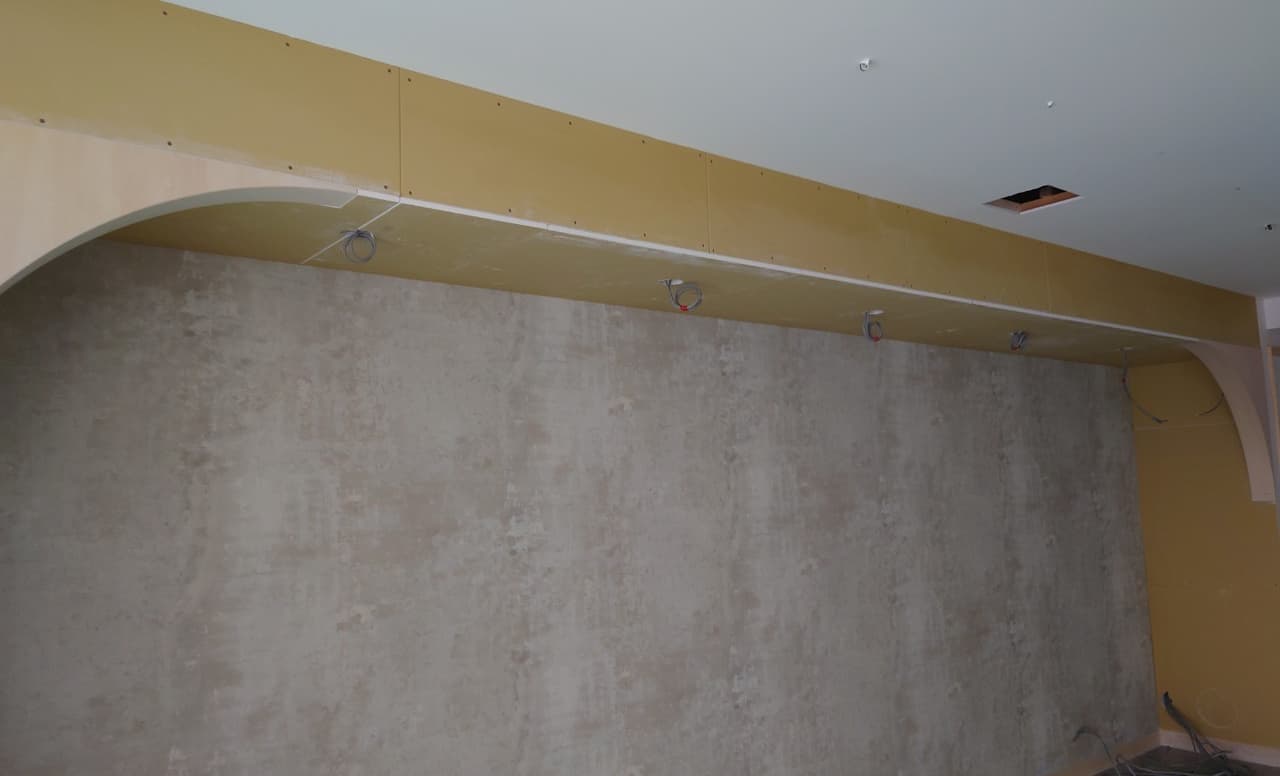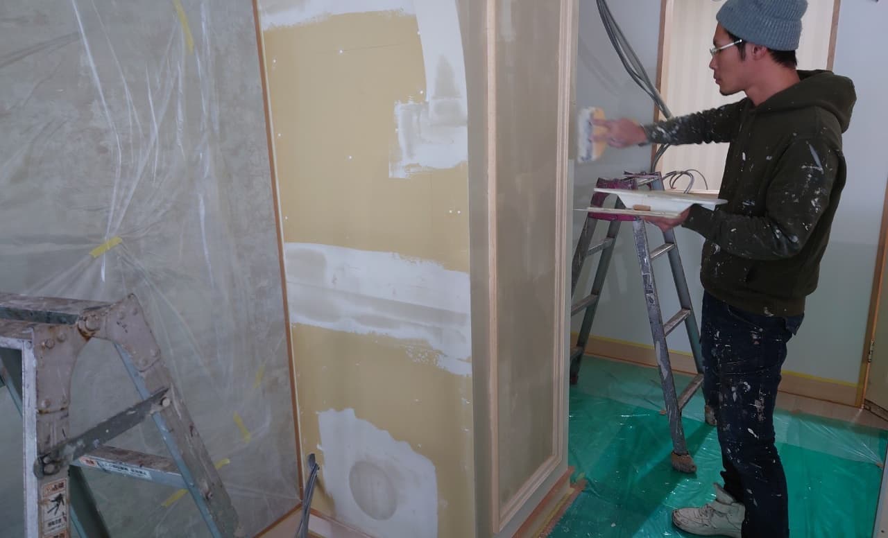 ボード面の下地とベニヤ下地で造られた壁を塗装仕上げで塗装します。
