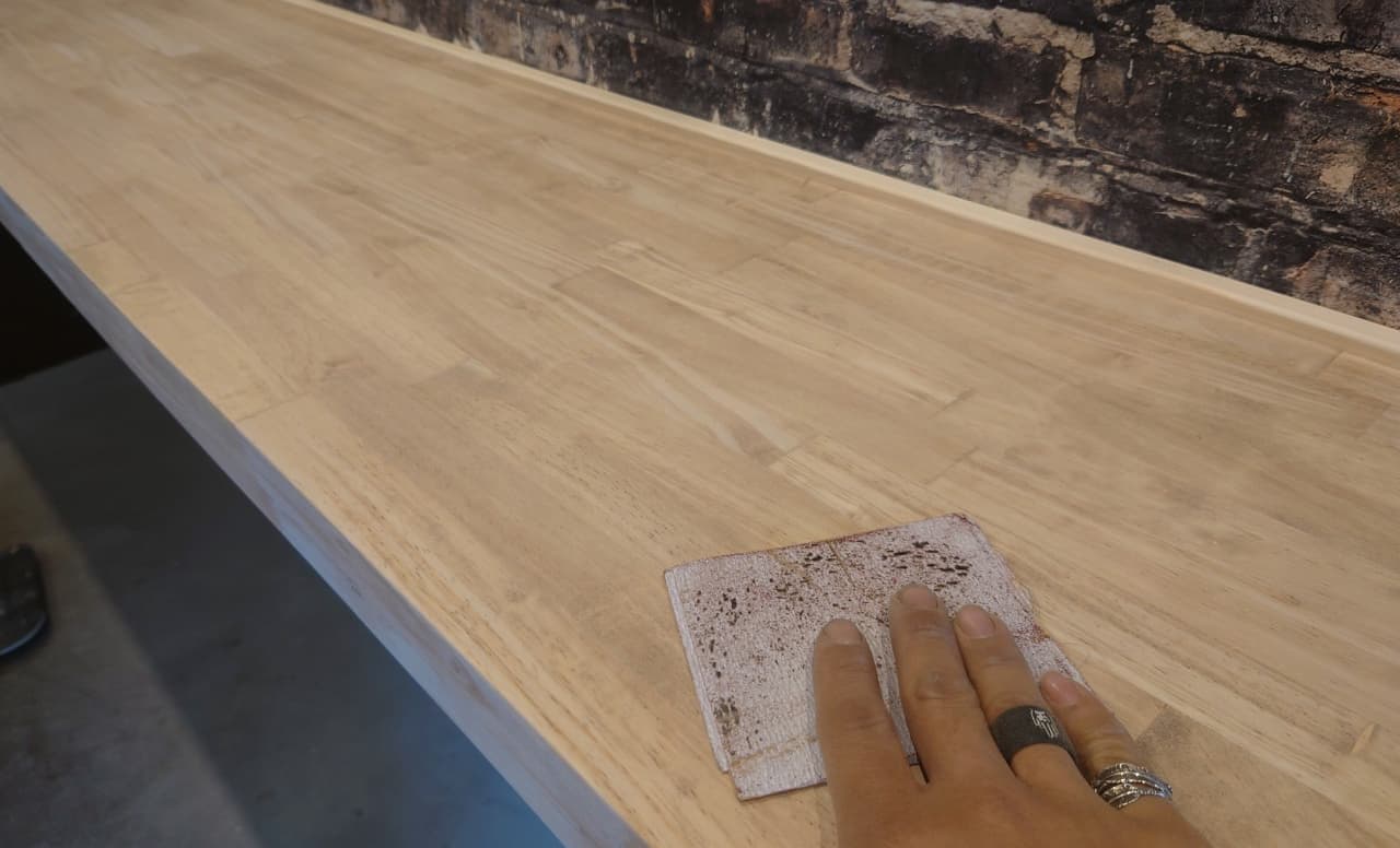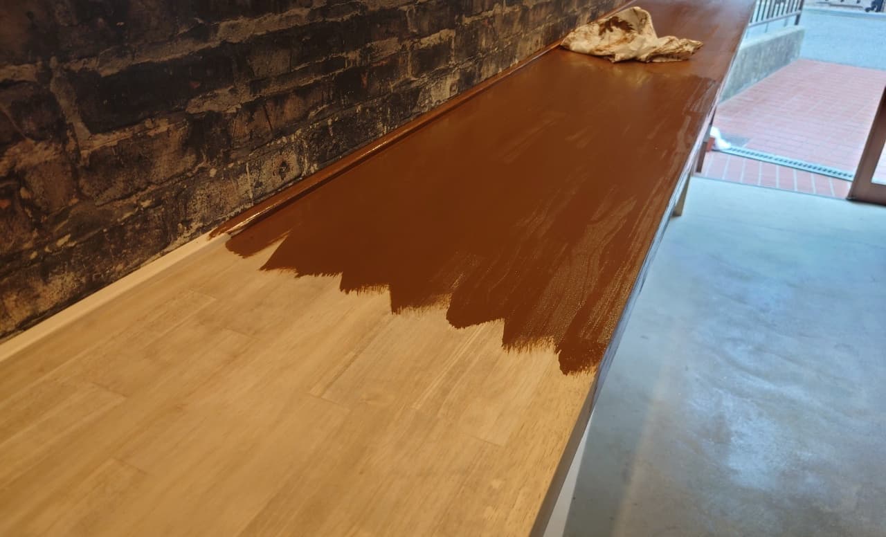 染色が終わりますと、次に肌触りを良くする為にサンディング材を塗って木材の目を詰めます。