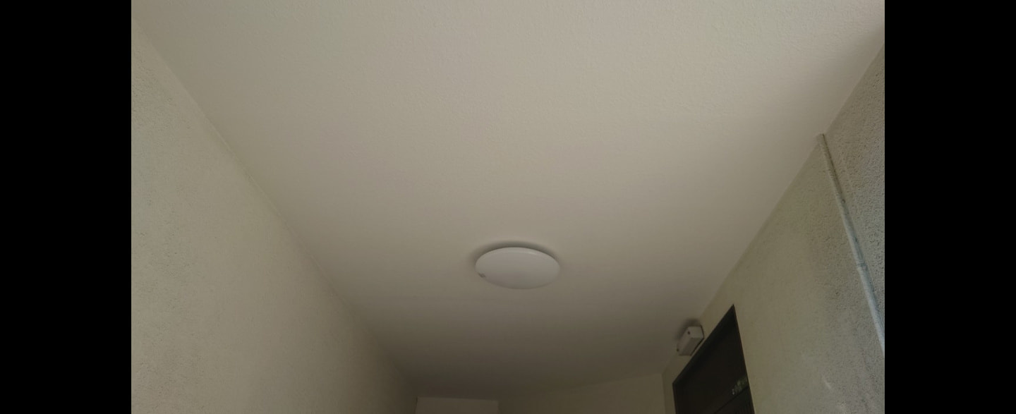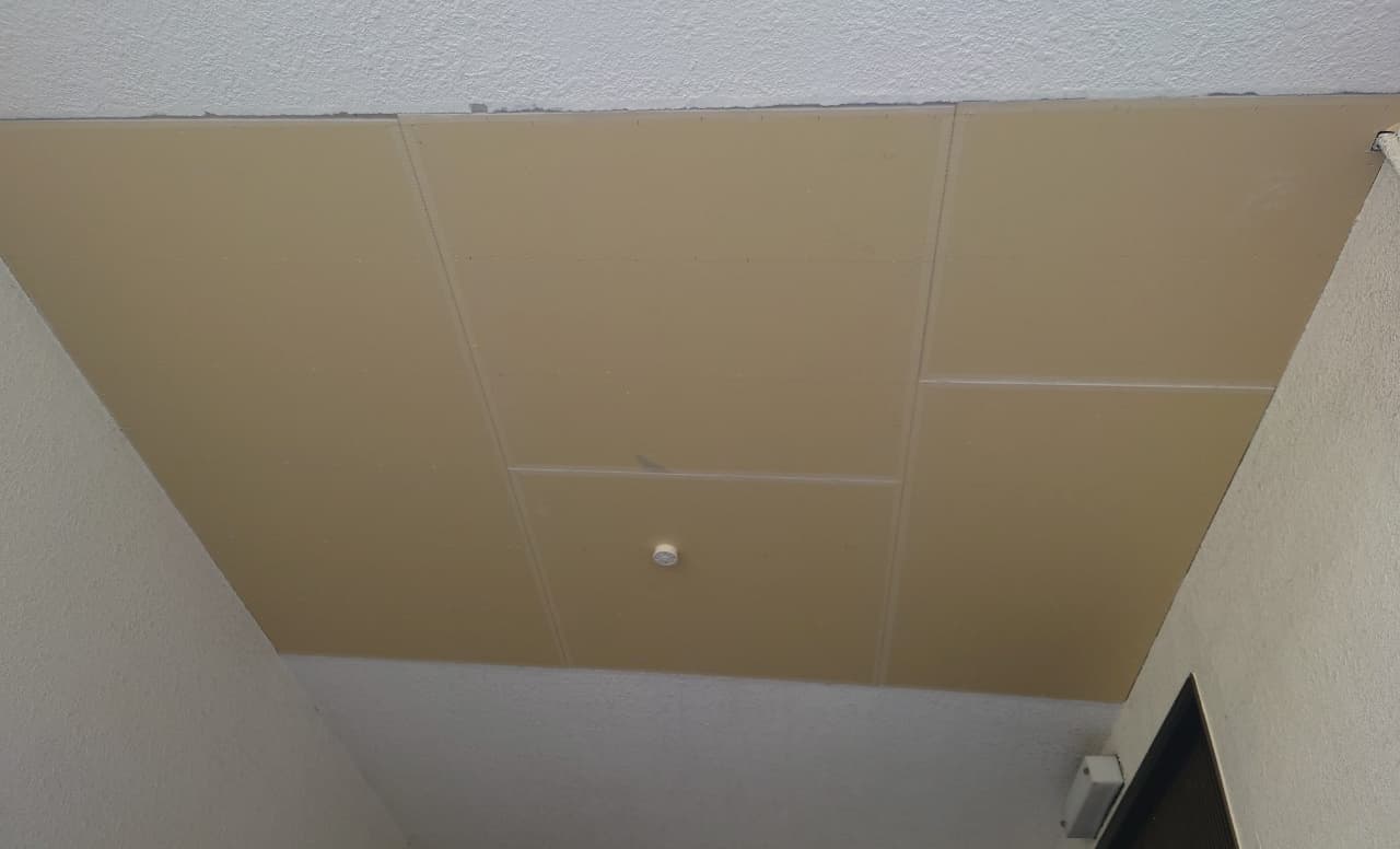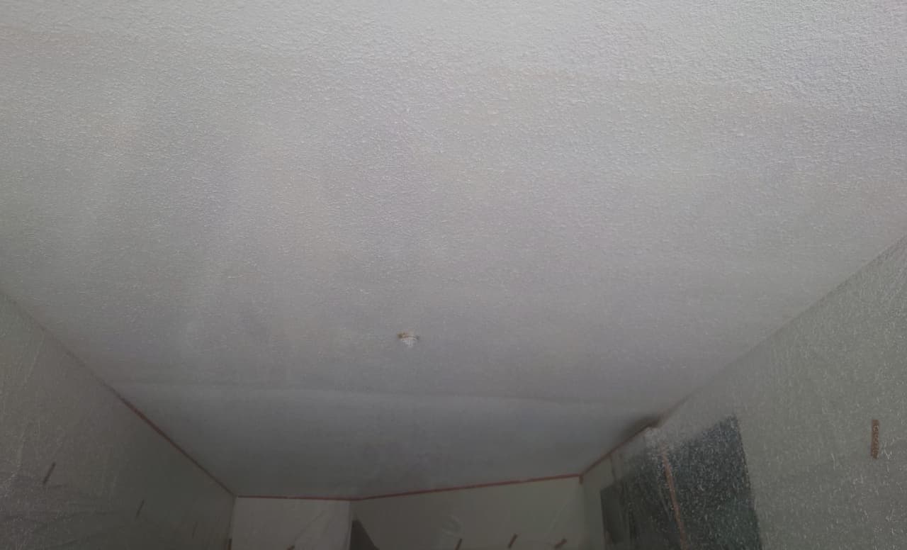 下地処理が終わりましたら、既存の天井壁の柄に合わせてパターン復旧の吹き付け作業です。