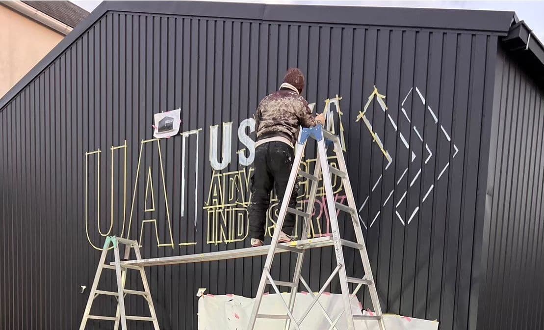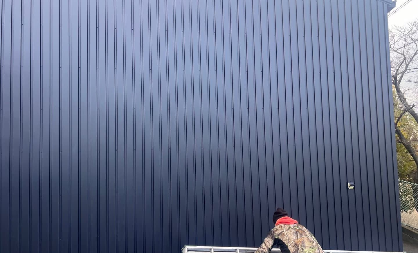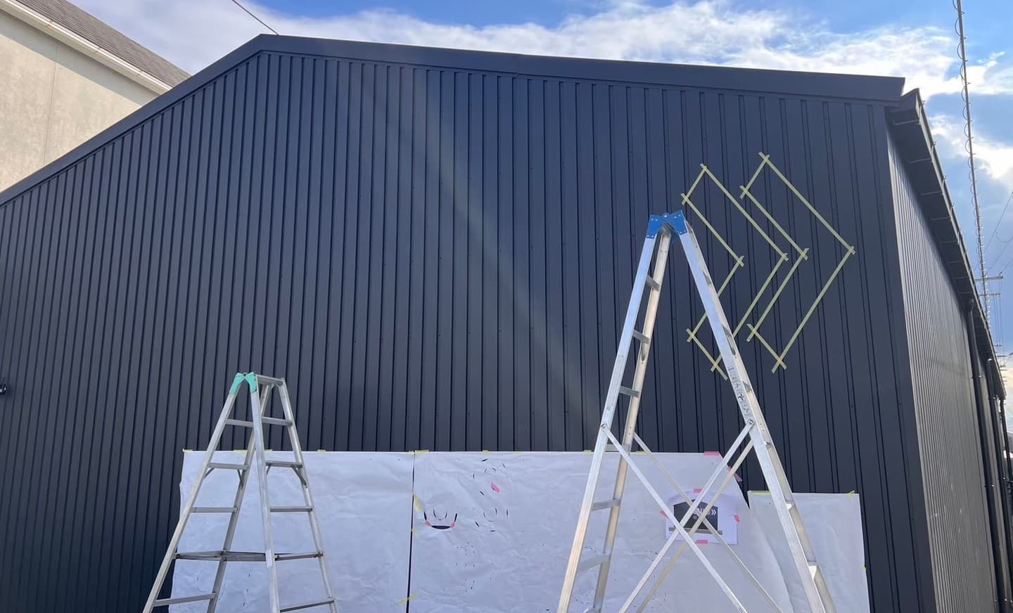 平らな面ではなく折れ曲がった折半壁なのでテープを貼った角部分へのにじみ込み等に気をつけながら書いていきます。