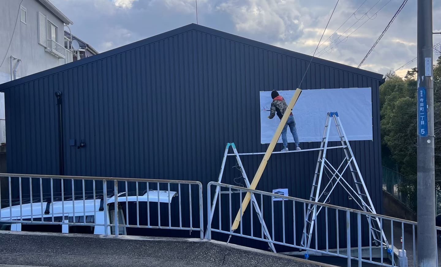 この折半壁に会社名を書かしてもらいます。