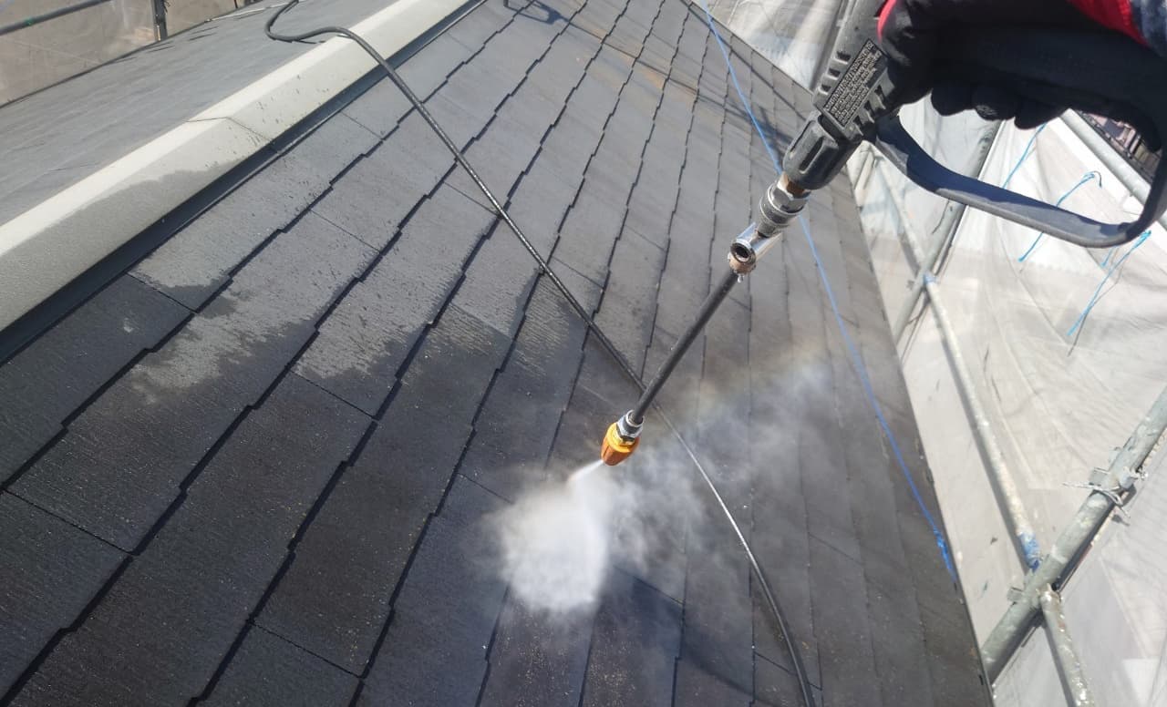 先ずは高圧洗浄で汚れや埃、古い塗膜などを洗い落としていきます。