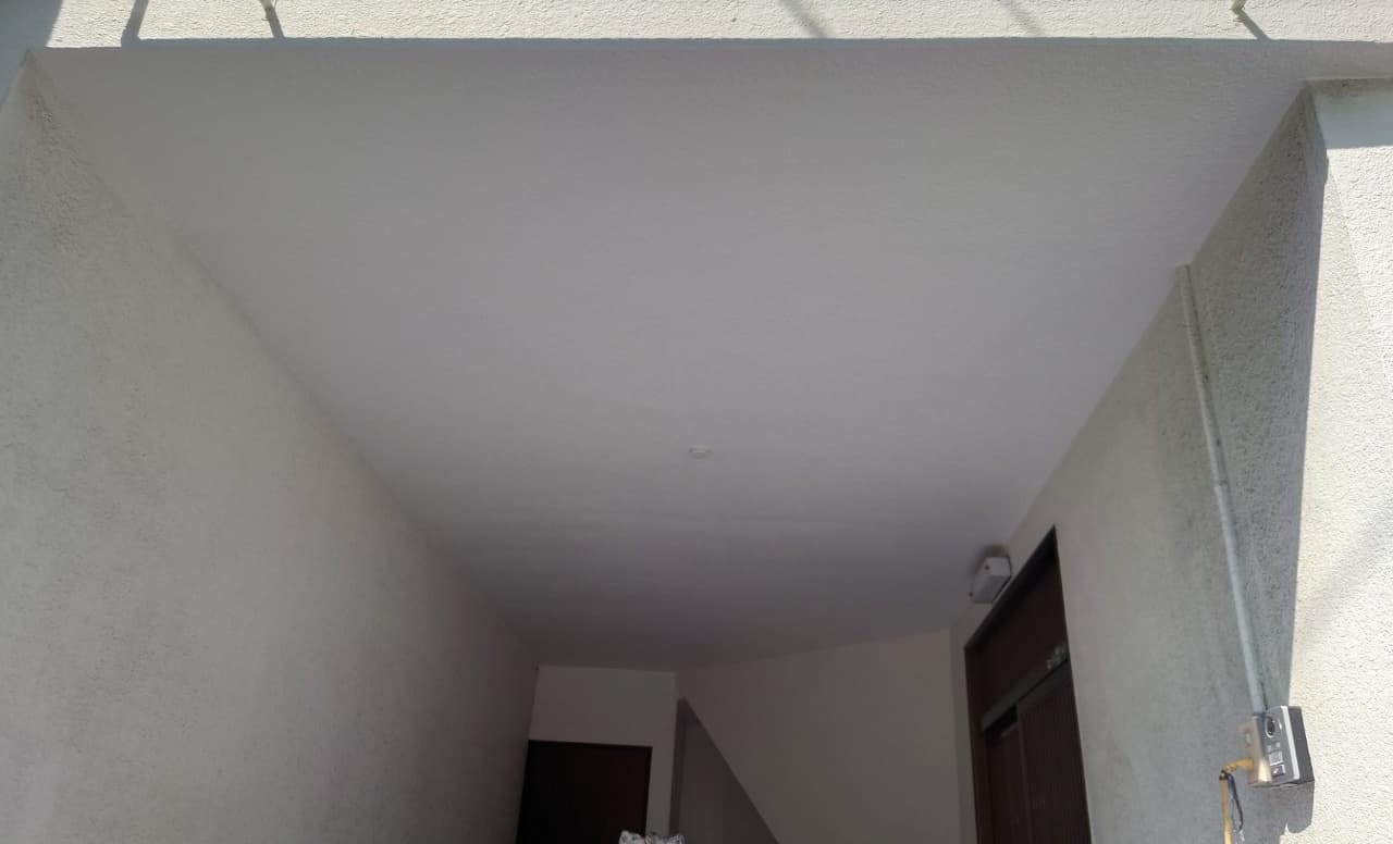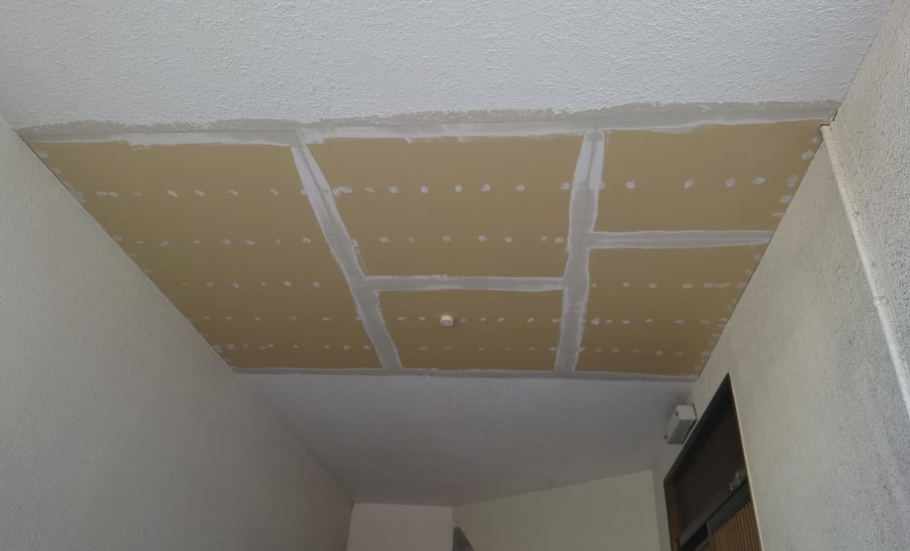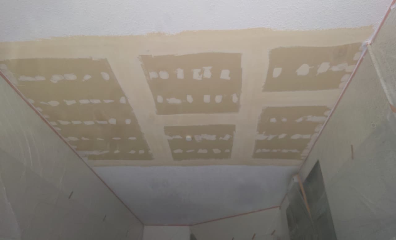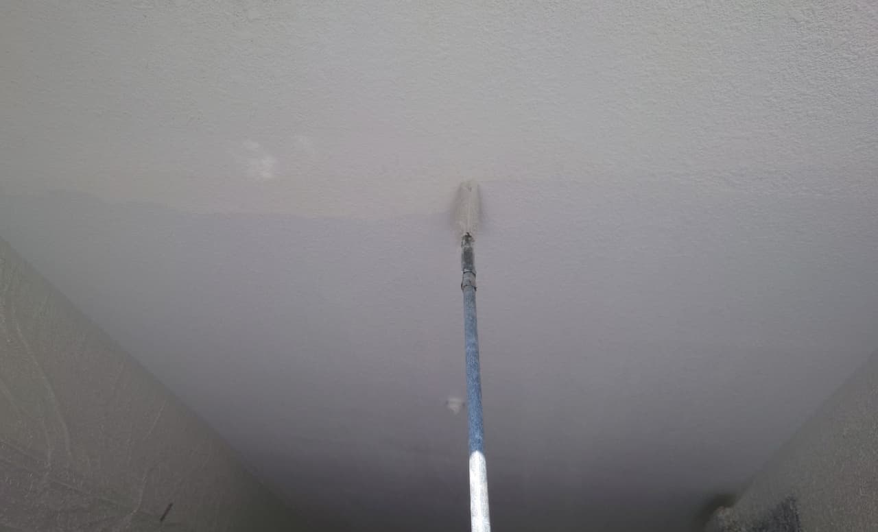 下地処理が終わりましたら、既存の天井壁の柄に合わせてパターン復旧の吹き付け作業です。